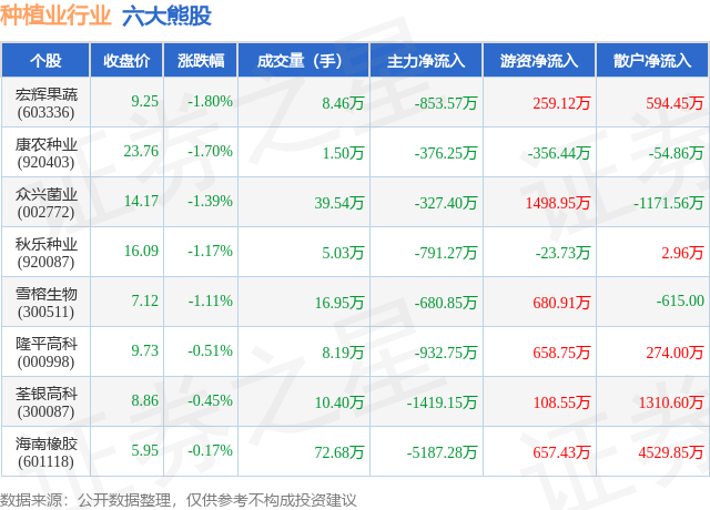 个股表现方面,种植业行业当日领跌股为宏辉果蔬(603336),该股当日报收9.25,下跌1.8%,成交量8.46万,主力资金净流出853.57万元。康农种业(920403)以下跌1.7%紧随其后,该股当日成交量1.5万,主力资金净流出376.25万元。除此之外,众兴菌业(002772)、秋乐种业(920087)、雪榕生物(300511)均进入当日熊股之列。具体个股列表见下表: