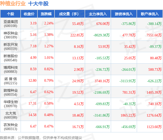 个股表现方面,种植业行业当日领涨股为亚盛集团(600108),该股当日报收3.19,上涨2.24%,成交量55.49万,主力资金净流入676.0万元。神农种业(300189)以上涨1.38%紧随其后,该股当日成交量222.85万,主力资金净流出8029.38万元。除此之外,新农开发(600359)、新赛股份(600540)、博闻科技(600883)均进入当日牛股之列。具体个股列表见下表: