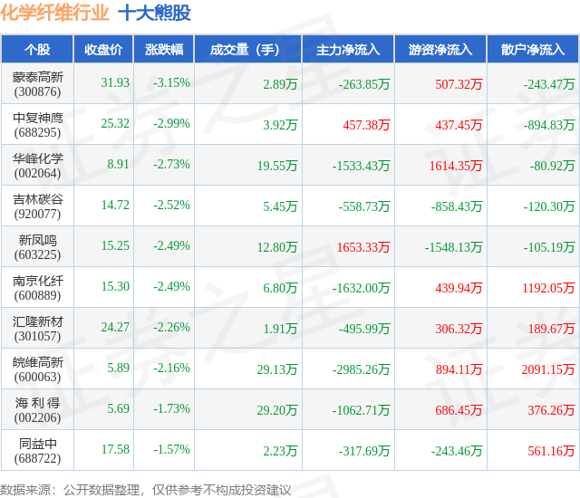 个股表现方面,化学纤维行业当日领跌股为蒙泰高新(300876),该股当日报收31.93,下跌3.15%,成交量2.89万,主力资金净流出263.85万元。中复神鹰(688295)以下跌2.99%紧随其后,该股当日成交量3.92万,主力资金净流入457.38万元。除此之外,华峰化学(002064)、吉林碳谷(920077)、新凤鸣(603225)均进入当日熊股之列。具体个股列表见下表: