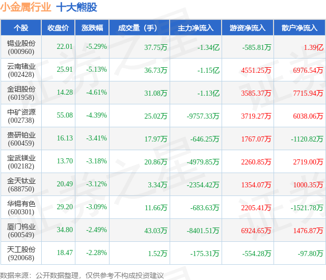 个股表现方面,小金属行业当日领跌股为锡业股份(000960),该股当日报收22.01,下跌5.29%,成交量37.75万,主力资金净流出1.34亿元。云南锗业(002428)以下跌5.13%紧随其后,该股当日成交量36.73万,主力资金净流出1.15亿元。除此之外,金钼股份(601958)、中矿资源(002738)、贵研铂业(600459)均进入当日熊股之列。具体个股列表见下表: