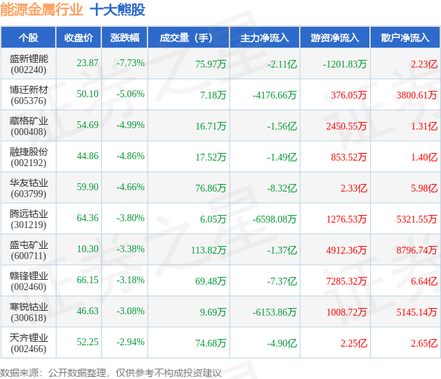 个股表现方面,能源金属行业当日领跌股为盛新锂能(002240),该股当日报收23.87,下跌7.73%,成交量75.97万,主力资金净流出2.11亿元。博迁新材(605376)以下跌5.06%紧随其后,该股当日成交量7.18万,主力资金净流出4176.66万元。除此之外,藏格矿业(000408)、融捷股份(002192)、华友钴业(603799)均进入当日熊股之列。具体个股列表见下表: