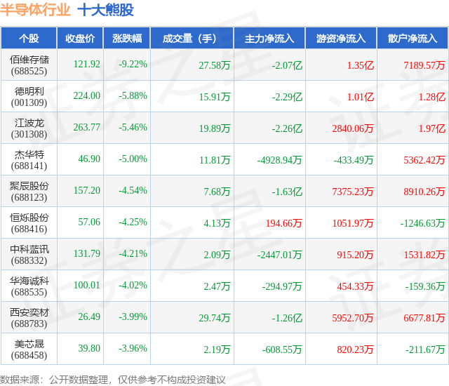 个股表现方面,半导体行业当日领跌股为佰维存储(688525),该股当日报收121.92,下跌9.22%,成交量27.58万,主力资金净流出2.07亿元。德明利(001309)以下跌5.88%紧随其后,该股当日成交量15.91万,主力资金净流出2.29亿元。除此之外,江波龙(301308)、杰华特(688141)、聚辰股份(688123)均进入当日熊股之列。具体个股列表见下表: