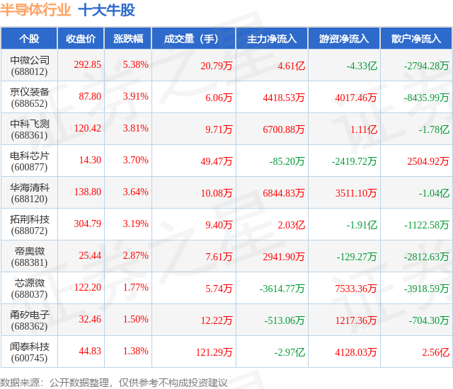 个股表现方面,半导体行业当日领涨股为中微公司(688012),该股当日报收292.85,上涨5.38%,成交量20.79万,主力资金净流入4.61亿元。京仪装备(688652)以上涨3.91%紧随其后,该股当日成交量6.06万,主力资金净流入4418.53万元。除此之外,中科飞测(688361)、电科芯片(600877)、华海清科(688120)均进入当日牛股之列。具体个股列表见下表: