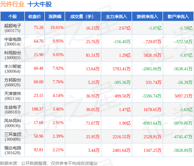 个股表现方面,元件行业当日领涨股为超颖电子(603175),该股当日报收75.2,上涨10.01%,成交量16.23万,主力资金净流入2.67亿元。中富电路(300814)以上涨9.95%紧随其后,该股当日成交量25.76万,主力资金净流出156.49万元。除此之外,科翔股份(300903)、本川智能(300964)、方邦股份(688020)均进入当日牛股之列。具体个股列表见下表: