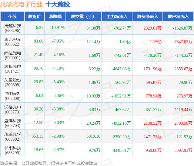 个股表现方面,光学光电子行业当日领跌股为清越科技(688496),该股当日报收6.37,下跌10.91%,成交量34.3万,主力资金净流出702.74万元。奥比中光(688322)以下跌7.05%紧随其后,该股当日成交量12.14万,主力资金净流出1.89亿元。除此之外,纬达光电(920001)、波长光电(301421)、久量股份(300808)均进入当日熊股之列。具体个股列表见下表:
