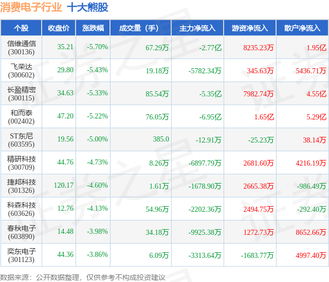 个股表现方面,消费电子行业当日领跌股为信维通信(300136),该股当日报收35.21,下跌5.7%,成交量67.29万,主力资金净流出2.77亿元。飞荣达(300602)以下跌5.43%紧随其后,该股当日成交量19.18万,主力资金净流出5782.34万元。除此之外,长盈精密(300115)、和而泰(002402)、ST东尼(603595)均进入当日熊股之列。具体个股列表见下表: