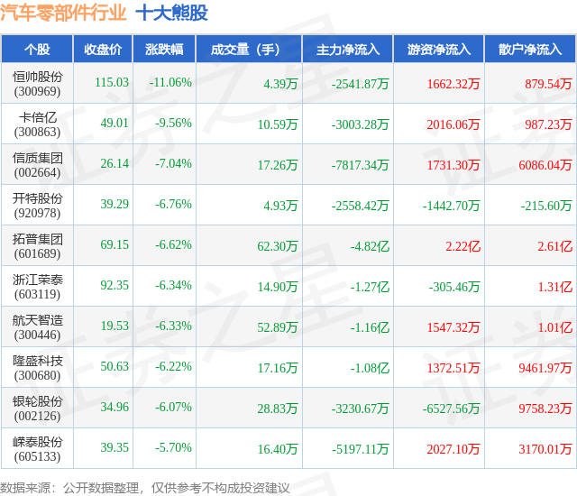个股表现方面,汽车零部件行业当日领跌股为恒帅股份(300969),该股当日报收115.03,下跌11.06%,成交量4.39万,主力资金净流出2541.87万元。卡倍亿(300863)以下跌9.56%紧随其后,该股当日成交量10.59万,主力资金净流出3003.28万元。除此之外,信质集团(002664)、开特股份(920978)、拓普集团(601689)均进入当日熊股之列。具体个股列表见下表:
