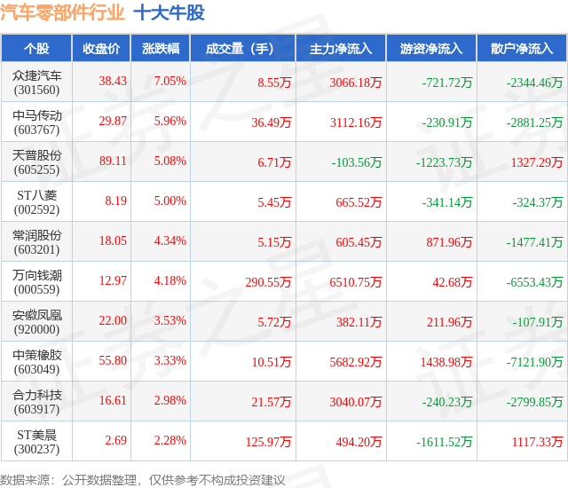个股表现方面,汽车零部件行业当日领涨股为众捷汽车(301560),该股当日报收38.43,上涨7.05%,成交量8.55万,主力资金净流入3066.18万元。中马传动(603767)以上涨5.96%紧随其后,该股当日成交量36.49万,主力资金净流入3112.16万元。除此之外,天普股份(605255)、ST八菱(002592)、常润股份(603201)均进入当日牛股之列。具体个股列表见下表: