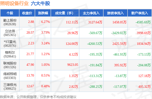 个股表现方面,照明设备行业当日领涨股为勤上股份(002638),该股当日报收2.88,上涨6.27%,成交量112.11万,主力资金净流入3127.64万元。立达信(605365)以上涨3.73%紧随其后,该股当日成交量28.96万,主力资金净流出569.67万元。除此之外,*ST星光(002076)、格利尔(920641)、联域股份(001326)均进入当日牛股之列。具体个股列表见下表: