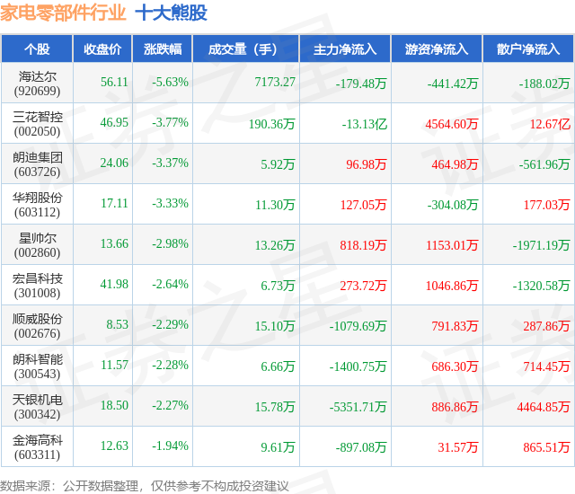 个股表现方面,家电零部件行业当日领跌股为海达尔(920699),该股当日报收56.11,下跌5.63%,成交量7173.0,主力资金净流出179.48万元。三花智控(002050)以下跌3.77%紧随其后,该股当日成交量190.36万,主力资金净流出13.13亿元。除此之外,朗迪集团(603726)、华翔股份(603112)、星帅尔(002860)均进入当日熊股之列。具体个股列表见下表:
