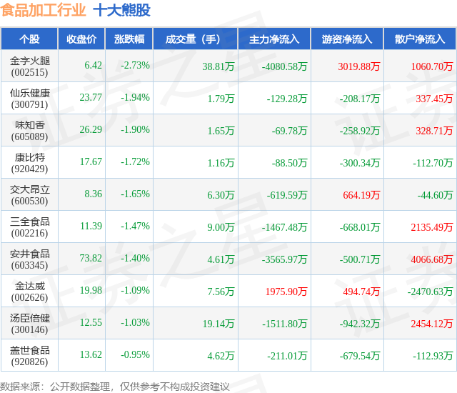 个股表现方面,食品加工行业当日领跌股为金字火腿(002515),该股当日报收6.42,下跌2.73%,成交量38.81万,主力资金净流出4080.58万元。仙乐健康(300791)以下跌1.94%紧随其后,该股当日成交量1.79万,主力资金净流出129.28万元。除此之外,味知香(605089)、康比特(920429)、交大昂立(600530)均进入当日熊股之列。具体个股列表见下表: