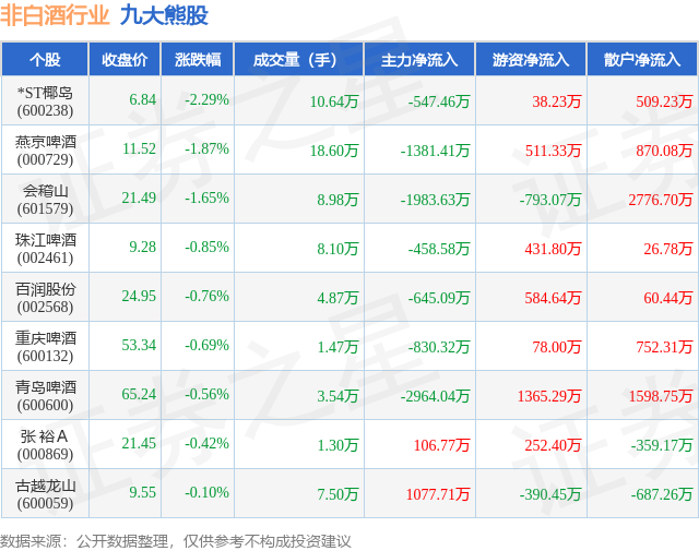 个股表现方面,非白酒行业当日领跌股为*ST椰岛(600238),该股当日报收6.84,下跌2.29%,成交量10.64万,主力资金净流出547.46万元。燕京啤酒(000729)以下跌1.87%紧随其后,该股当日成交量18.6万,主力资金净流出1381.41万元。除此之外,会稽山(601579)、珠江啤酒(002461)、百润股份(002568)均进入当日熊股之列。具体个股列表见下表: