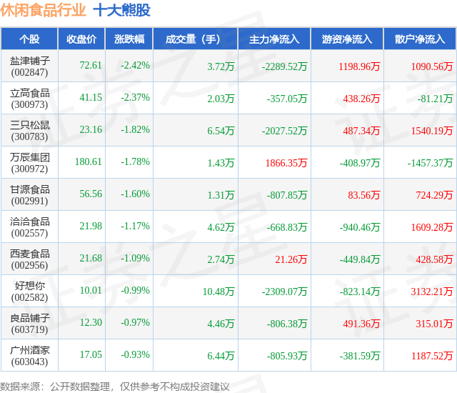 个股表现方面,休闲食品行业当日领跌股为盐津铺子(002847),该股当日报收72.61,下跌2.42%,成交量3.72万,主力资金净流出2289.52万元。立高食品(300973)以下跌2.37%紧随其后,该股当日成交量2.03万,主力资金净流出357.05万元。除此之外,三只松鼠(300783)、万辰集团(300972)、甘源食品(002991)均进入当日熊股之列。具体个股列表见下表: