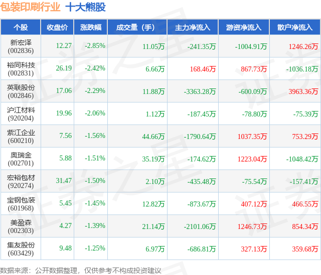 个股表现方面,包装印刷行业当日领跌股为新宏泽(002836),该股当日报收12.27,下跌2.85%,成交量11.05万,主力资金净流出241.35万元。裕同科技(002831)以下跌2.42%紧随其后,该股当日成交量6.66万,主力资金净流入168.46万元。除此之外,英联股份(002846)、沪江材料(920204)、紫江企业(600210)均进入当日熊股之列。具体个股列表见下表: