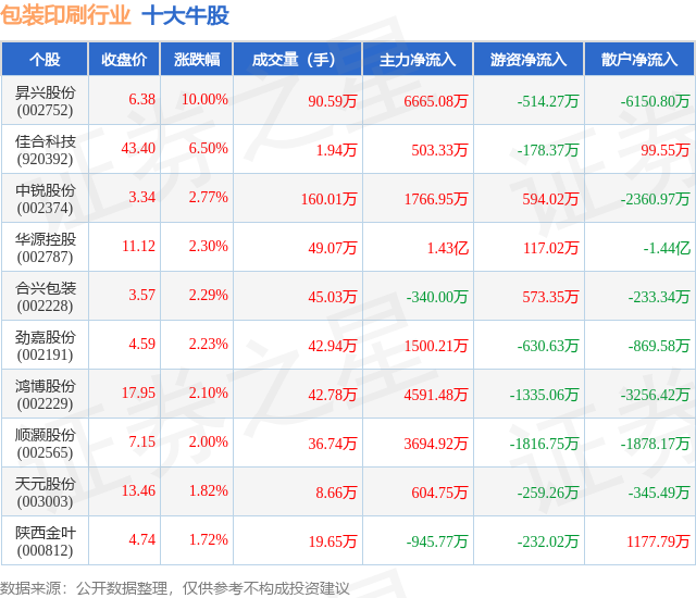 个股表现方面,包装印刷行业当日领涨股为昇兴股份(002752),该股当日报收6.38,上涨10.0%,成交量90.59万,主力资金净流入6665.08万元。佳合科技(920392)以上涨6.5%紧随其后,该股当日成交量1.94万,主力资金净流入503.33万元。除此之外,中锐股份(002374)、华源控股(002787)、合兴包装(002228)均进入当日牛股之列。具体个股列表见下表: