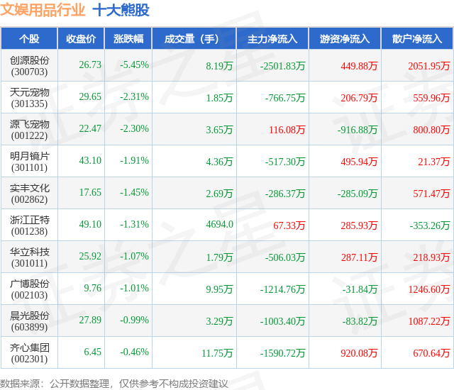 个股表现方面,文娱用品行业当日领跌股为创源股份(300703),该股当日报收26.73,下跌5.45%,成交量8.19万,主力资金净流出2501.83万元。天元宠物(301335)以下跌2.31%紧随其后,该股当日成交量1.85万,主力资金净流出766.75万元。除此之外,源飞宠物(001222)、明月镜片(301101)、实丰文化(002862)均进入当日熊股之列。具体个股列表见下表: