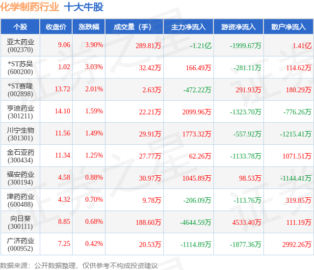 个股表现方面,化学制药行业当日领涨股为亚太药业(002370),该股当日报收9.06,上涨3.9%,成交量289.81万,主力资金净流出1.21亿元。*ST苏吴(600200)以上涨3.03%紧随其后,该股当日成交量32.42万,主力资金净流入166.49万元。除此之外,*ST赛隆(002898)、亨迪药业(301211)、川宁生物(301301)均进入当日牛股之列。具体个股列表见下表: