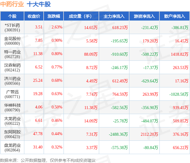个股表现方面,中药行业当日领涨股为*ST长药(300391),该股当日报收3.51,上涨2.63%,成交量14.65万,主力资金净流入618.23万元。金花股份(600080)以上涨0.9%紧随其后,该股当日成交量5.58万,主力资金净流出195.65万元。除此之外,特一药业(002728)、汉森制药(002412)、济川药业(600566)均进入当日牛股之列。具体个股列表见下表: