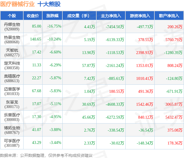 个股表现方面,医疗器械行业当日领跌股为丹娜生物(920009),该股当日报收85.0,下跌16.75%,成交量4.41万,主力资金净流出7454.5万元。热景生物(688068)以下跌10.24%紧随其后,该股当日成交量5.19万,主力资金净流出6139.33万元。除此之外,天智航(688277)、楚天科技(300358)、奥精医疗(688613)均进入当日熊股之列。具体个股列表见下表: