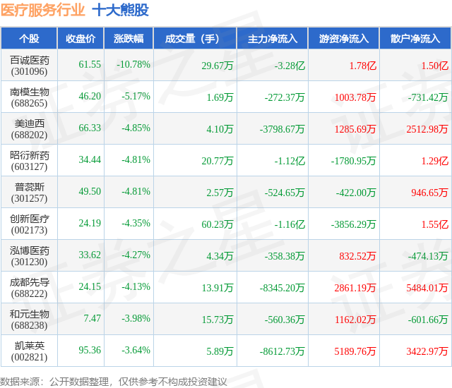 个股表现方面,医疗服务行业当日领跌股为百诚医药(301096),该股当日报收61.55,下跌10.78%,成交量29.67万,主力资金净流出3.28亿元。南模生物(688265)以下跌5.17%紧随其后,该股当日成交量1.69万,主力资金净流出272.37万元。除此之外,美迪西(688202)、昭衍新药(603127)、普蕊斯(301257)均进入当日熊股之列。具体个股列表见下表:
