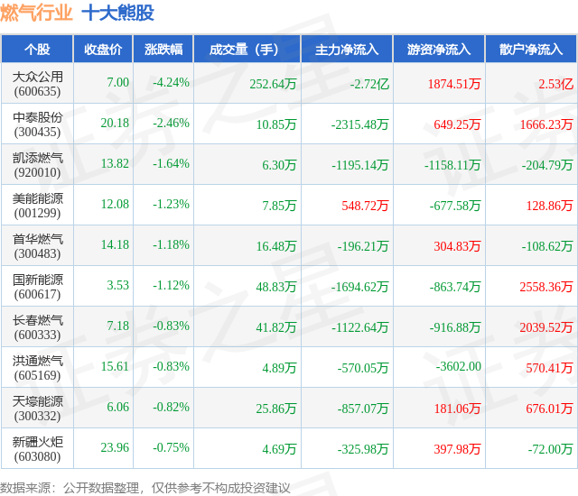 个股表现方面,燃气行业当日领跌股为大众公用(600635),该股当日报收7.0,下跌4.24%,成交量252.64万,主力资金净流出2.72亿元。中泰股份(300435)以下跌2.46%紧随其后,该股当日成交量10.85万,主力资金净流出2315.48万元。除此之外,凯添燃气(920010)、美能能源(001299)、首华燃气(300483)均进入当日熊股之列。具体个股列表见下表: