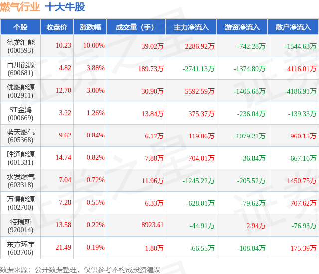 个股表现方面,燃气行业当日领涨股为德龙汇能(000593),该股当日报收10.23,上涨10.0%,成交量39.02万,主力资金净流入2286.92万元。百川能源(600681)以上涨3.88%紧随其后,该股当日成交量189.73万,主力资金净流出2741.13万元。除此之外,佛燃能源(002911)、ST金鸿(000669)、蓝天燃气(605368)均进入当日牛股之列。具体个股列表见下表:
