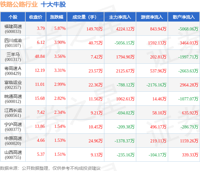 个股表现方面,铁路公路行业当日领涨股为福建高速(600033),该股当日报收3.79,上涨5.87%,成交量149.7万,主力资金净流入4224.12万元。四川成渝(601107)以上涨3.9%紧随其后,该股当日成交量40.75万,主力资金净流出5056.15万元。除此之外,三羊马(001317)、粤高速A(000429)、富临运业(002357)均进入当日牛股之列。具体个股列表见下表:
