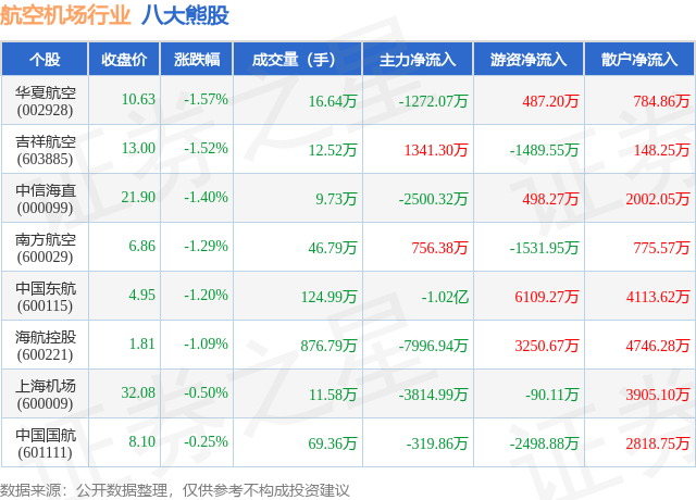 个股表现方面,航空机场行业当日领跌股为华夏航空(002928),该股当日报收10.63,下跌1.57%,成交量16.64万,主力资金净流出1272.07万元。吉祥航空(603885)以下跌1.52%紧随其后,该股当日成交量12.52万,主力资金净流入1341.3万元。除此之外,中信海直(000099)、南方航空(600029)、中国东航(600115)均进入当日熊股之列。具体个股列表见下表: