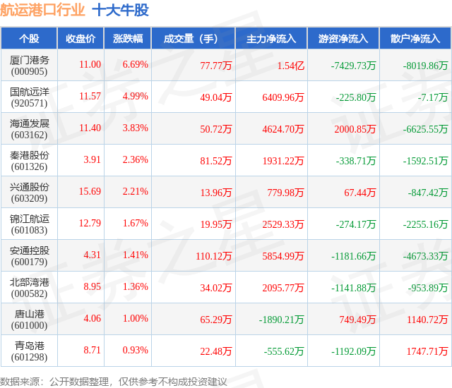 个股表现方面,航运港口行业当日领涨股为厦门港务(000905),该股当日报收11.0,上涨6.69%,成交量77.77万,主力资金净流入1.54亿元。国航远洋(920571)以上涨4.99%紧随其后,该股当日成交量49.04万,主力资金净流入6409.96万元。除此之外,海通发展(603162)、秦港股份(601326)、兴通股份(603209)均进入当日牛股之列。具体个股列表见下表: