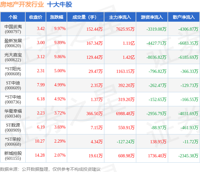 个股表现方面,房地产开发行业当日领涨股为中国武夷(000797),该股当日报收3.42,上涨9.97%,成交量152.44万,主力资金净流入7625.95万元。盈新发展(000620)以上涨9.89%紧随其后,该股当日成交量167.34万,主力资金净流入1.11亿元。除此之外,光大嘉宝(600622)、*ST阳光(000608)、ST中迪(000609)均进入当日牛股之列。具体个股列表见下表: