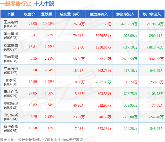 个股表现方面,一般零售行业当日领涨股为国光连锁(605188),该股当日报收23.05,上涨10.02%,成交量26.34万,主力资金净流入1.59亿元。东百集团(600693)以上涨3.72%紧随其后,该股当日成交量79.21万,主力资金净流入5276.53万元。除此之外,欧亚集团(600697)、丽尚国潮(600738)、广百股份(002187)均进入当日牛股之列。具体个股列表见下表: