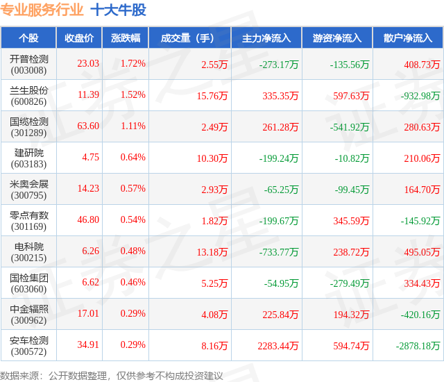 个股表现方面,专业服务行业当日领涨股为开普检测(003008),该股当日报收23.03,上涨1.72%,成交量2.55万,主力资金净流出273.17万元。兰生股份(600826)以上涨1.52%紧随其后,该股当日成交量15.76万,主力资金净流入335.35万元。除此之外,国缆检测(301289)、建研院(603183)、米奥会展(300795)均进入当日牛股之列。具体个股列表见下表: