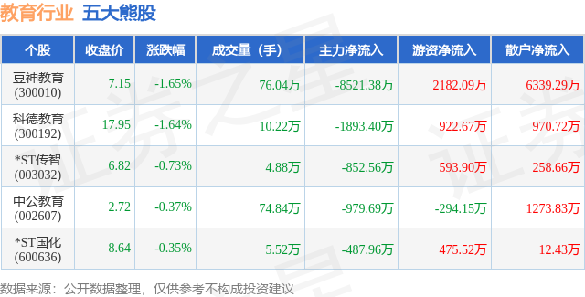 个股表现方面,教育行业当日领跌股为豆神教育(300010),该股当日报收7.15,下跌1.65%,成交量76.04万,主力资金净流出8521.38万元。科德教育(300192)以下跌1.64%紧随其后,该股当日成交量10.22万,主力资金净流出1893.4万元。除此之外,*ST传智(003032)、中公教育(002607)、*ST国化(600636)均进入当日熊股之列。具体个股列表见下表: