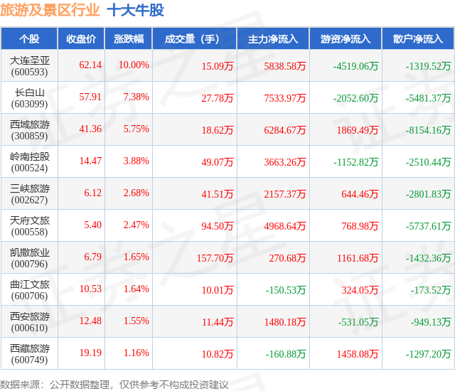 个股表现方面,旅游及景区行业当日领涨股为大连圣亚(600593),该股当日报收62.14,上涨10.0%,成交量15.09万,主力资金净流入5838.58万元。长白山(603099)以上涨7.38%紧随其后,该股当日成交量27.78万,主力资金净流入7533.97万元。除此之外,西域旅游(300859)、岭南控股(000524)、三峡旅游(002627)均进入当日牛股之列。具体个股列表见下表: