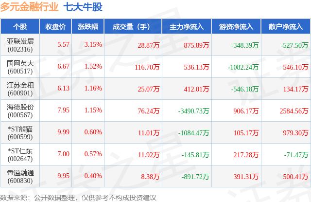 个股表现方面,多元金融行业当日领涨股为亚联发展(002316),该股当日报收5.57,上涨3.15%,成交量28.87万,主力资金净流入875.89万元。国网英大(600517)以上涨1.52%紧随其后,该股当日成交量116.7万,主力资金净流入536.13万元。除此之外,江苏金租(600901)、海德股份(000567)、*ST熊猫(600599)均进入当日牛股之列。具体个股列表见下表: