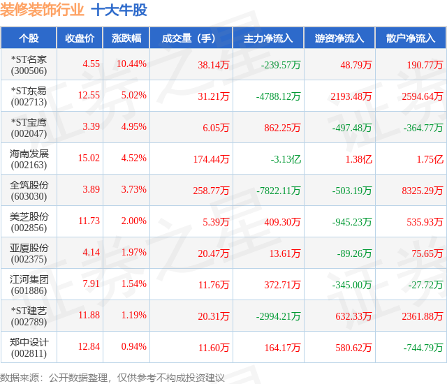 个股表现方面,装修装饰行业当日领涨股为*ST名家(300506),该股当日报收4.55,上涨10.44%,成交量38.14万,主力资金净流出239.57万元。*ST东易(002713)以上涨5.02%紧随其后,该股当日成交量31.21万,主力资金净流出4788.12万元。除此之外,*ST宝鹰(002047)、海南发展(002163)、全筑股份(603030)均进入当日牛股之列。具体个股列表见下表: