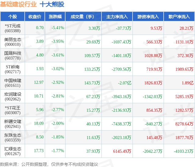 个股表现方面,基础建设行业当日领跌股为*ST元成(603388),该股当日报收0.7,下跌5.41%,成交量3.3万,主力资金净流出37.73万元。美丽生态(000010)以下跌3.95%紧随其后,该股当日成交量29.69万,主力资金净流出1697.43万元。除此之外,国晟科技(603778)、ST岭南(002717)、中国核建(601611)均进入当日熊股之列。具体个股列表见下表: