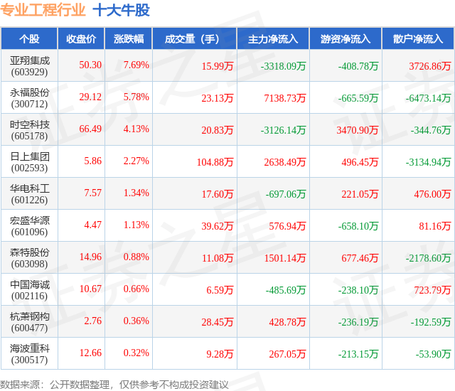 个股表现方面,专业工程行业当日领涨股为亚翔集成(603929),该股当日报收50.3,上涨7.69%,成交量15.99万,主力资金净流出3318.09万元。永福股份(300712)以上涨5.78%紧随其后,该股当日成交量23.13万,主力资金净流入7138.73万元。除此之外,时空科技(605178)、日上集团(002593)、华电科工(601226)均进入当日牛股之列。具体个股列表见下表:
