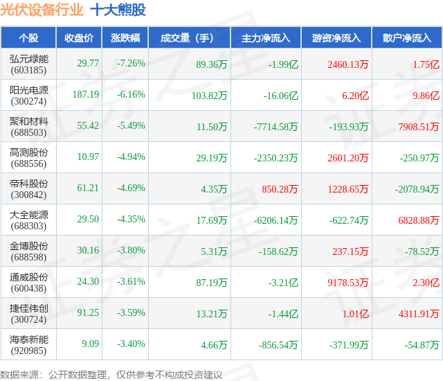 个股表现方面,光伏设备行业当日领跌股为弘元绿能(603185),该股当日报收29.77,下跌7.26%,成交量89.36万,主力资金净流出1.99亿元。阳光电源(300274)以下跌6.16%紧随其后,该股当日成交量103.82万,主力资金净流出16.06亿元。除此之外,聚和材料(688503)、高测股份(688556)、帝科股份(300842)均进入当日熊股之列。具体个股列表见下表: