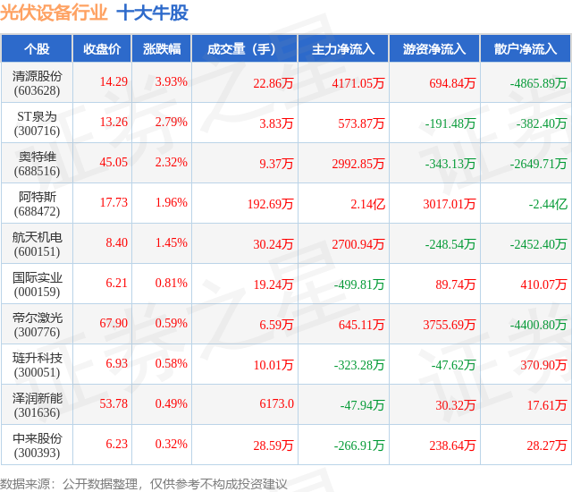 个股表现方面,光伏设备行业当日领涨股为清源股份(603628),该股当日报收14.29,上涨3.93%,成交量22.86万,主力资金净流入4171.05万元。ST泉为(300716)以上涨2.79%紧随其后,该股当日成交量3.83万,主力资金净流入573.87万元。除此之外,奥特维(688516)、阿特斯(688472)、航天机电(600151)均进入当日牛股之列。具体个股列表见下表: