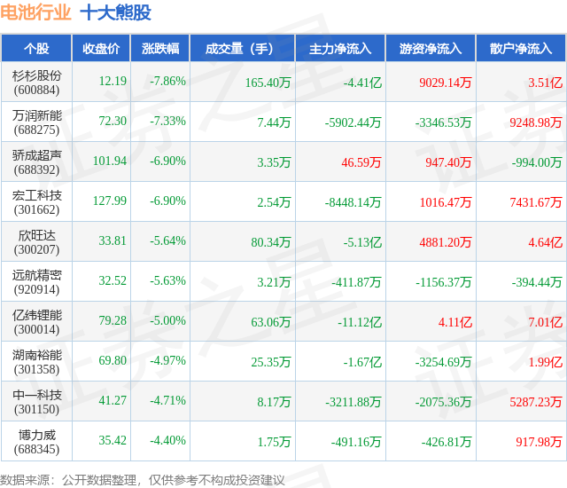 个股表现方面,电池行业当日领跌股为杉杉股份(600884),该股当日报收12.19,下跌7.86%,成交量165.4万,主力资金净流出4.41亿元。万润新能(688275)以下跌7.33%紧随其后,该股当日成交量7.44万,主力资金净流出5902.44万元。除此之外,骄成超声(688392)、宏工科技(301662)、欣旺达(300207)均进入当日熊股之列。具体个股列表见下表: