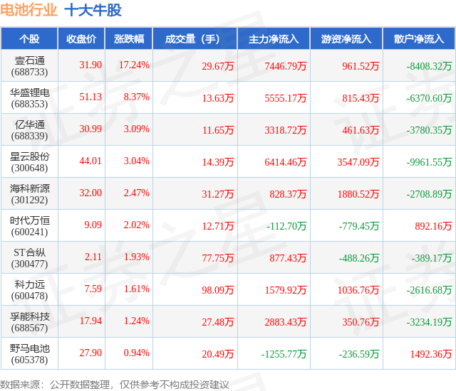 个股表现方面,电池行业当日领涨股为壹石通(688733),该股当日报收31.9,上涨17.24%,成交量29.67万,主力资金净流入7446.79万元。华盛锂电(688353)以上涨8.37%紧随其后,该股当日成交量13.63万,主力资金净流入5555.17万元。除此之外,亿华通(688339)、星云股份(300648)、海科新源(301292)均进入当日牛股之列。具体个股列表见下表: