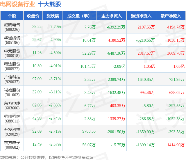 个股表现方面,电网设备行业当日领跌股为威腾电气(688226),该股当日报收39.22,下跌7.7%,成交量7.76万,主力资金净流出6392.29万元。华通线缆(605196)以下跌4.9%紧随其后,该股当日成交量16.61万,主力资金净流入4180.52万元。除此之外,中元股份(300018)、精达股份(600577)、广信科技(920037)均进入当日熊股之列。具体个股列表见下表: