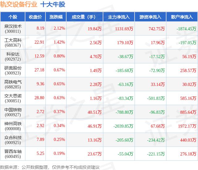 个股表现方面,轨交设备行业当日领涨股为鼎汉技术(300011),该股当日报收8.19,上涨2.12%,成交量19.84万,主力资金净流入1131.69万元。工大高科(688367)以上涨1.42%紧随其后,该股当日成交量2.56万,主力资金净流入179.1万元。除此之外,科安达(002972)、研奥股份(300923)、高铁电气(688285)均进入当日牛股之列。具体个股列表见下表: