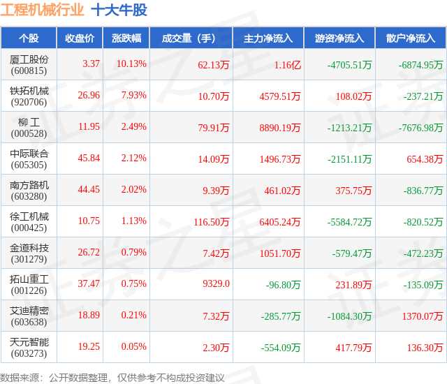 个股表现方面,工程机械行业当日领涨股为厦工股份(600815),该股当日报收3.37,上涨10.13%,成交量62.13万,主力资金净流入1.16亿元。铁拓机械(920706)以上涨7.93%紧随其后,该股当日成交量10.7万,主力资金净流入4579.51万元。除此之外,柳 工(000528)、中际联合(605305)、南方路机(603280)均进入当日牛股之列。具体个股列表见下表: