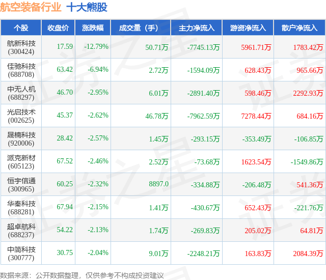 个股表现方面,航空装备行业当日领跌股为航新科技(300424),该股当日报收17.59,下跌12.79%,成交量50.71万,主力资金净流出7745.13万元。佳驰科技(688708)以下跌6.94%紧随其后,该股当日成交量2.72万,主力资金净流出1594.09万元。除此之外,中无人机(688297)、光启技术(002625)、晟楠科技(920006)均进入当日熊股之列。具体个股列表见下表: