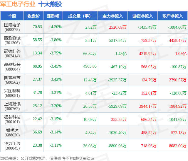 个股表现方面,军工电子行业当日领跌股为国博电子(688375),该股当日报收70.53,下跌4.2%,成交量2.82万,主力资金净流入2520.09万元。西测测试(301306)以下跌3.86%紧随其后,该股当日成交量5.51万,主力资金净流出5217.84万元。除此之外,高德红外(002414)、晶品特装(688084)、国睿科技(600562)均进入当日熊股之列。具体个股列表见下表: