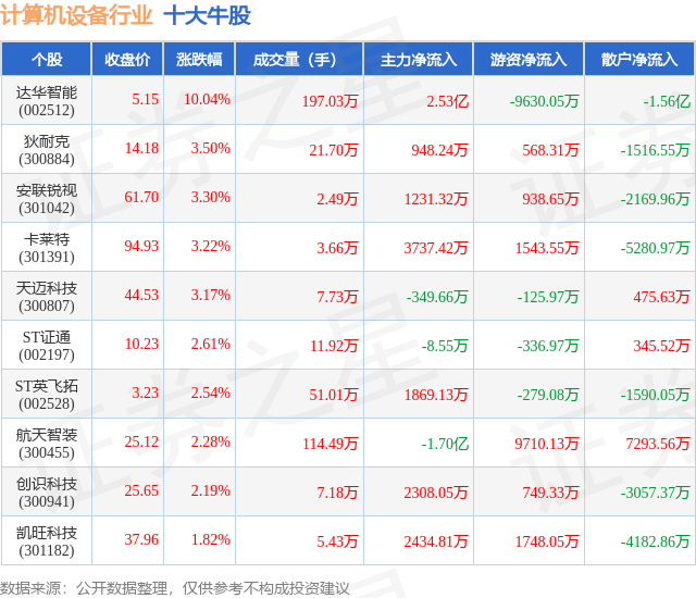 个股表现方面,计算机设备行业当日领涨股为达华智能(002512),该股当日报收5.15,上涨10.04%,成交量197.03万,主力资金净流入2.53亿元。狄耐克(300884)以上涨3.5%紧随其后,该股当日成交量21.7万,主力资金净流入948.24万元。除此之外,安联锐视(301042)、卡莱特(301391)、天迈科技(300807)均进入当日牛股之列。具体个股列表见下表: