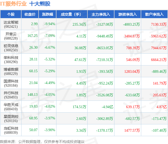 个股表现方面,IT服务行业当日领跌股为达实智能(002421),该股当日报收2.99,下跌9.94%,成交量235.34万,主力资金净流出3127.08万元。开普云(688228)以下跌7.09%紧随其后,该股当日成交量4.11万,主力资金净流出9448.49万元。除此之外,初灵信息(300250)、荣科科技(300290)、博睿数据(688229)均进入当日熊股之列。具体个股列表见下表: