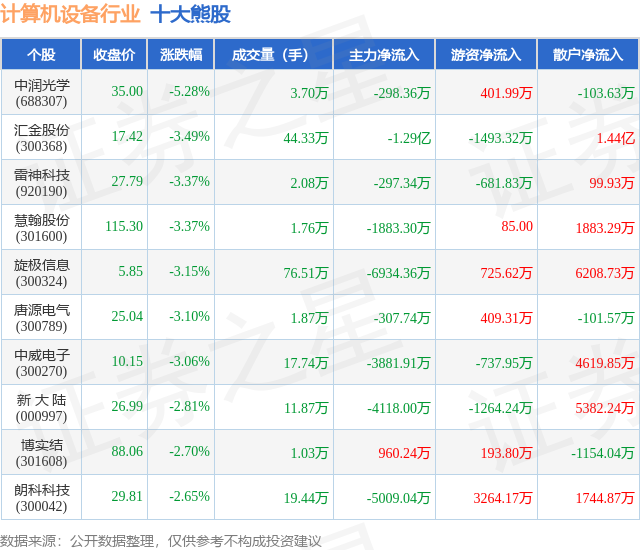 个股表现方面,计算机设备行业当日领跌股为中润光学(688307),该股当日报收35.0,下跌5.28%,成交量3.7万,主力资金净流出298.36万元。汇金股份(300368)以下跌3.49%紧随其后,该股当日成交量44.33万,主力资金净流出1.29亿元。除此之外,雷神科技(920190)、慧翰股份(301600)、旋极信息(300324)均进入当日熊股之列。具体个股列表见下表: